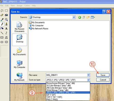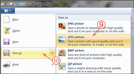 09) در پنجره باز شده اگر فرمت پیش فرض jpeg بود که هیچ، اگر نبود این فرمت را انتخاب کنید، چرا؟ چون این فرمت فشرده ترین فرمت عکس است (برای مناظر طبیعی) که کیفیت را هم حفظ میکند . این قسمت در هر دو ویندوز xp و 7 مشابه هستند.