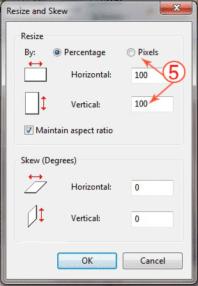 5) پنجره resaize and skw باز میشود. در قسمت resaize باید برای گزینههای horizontal (افقی) و vertical (عمودی) عدد مورد نظر را وارد کنید.
